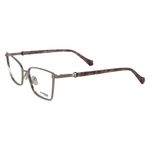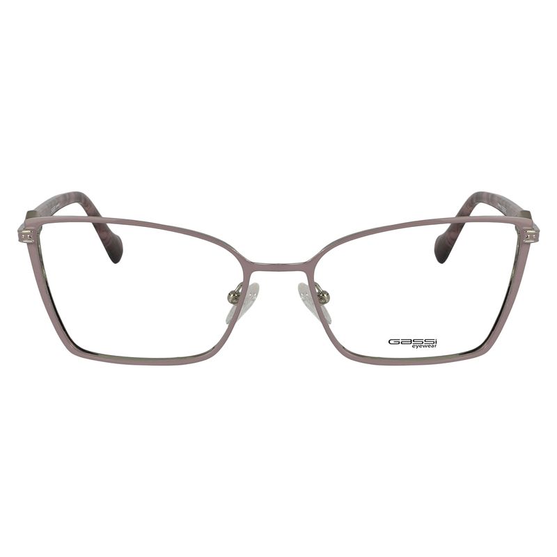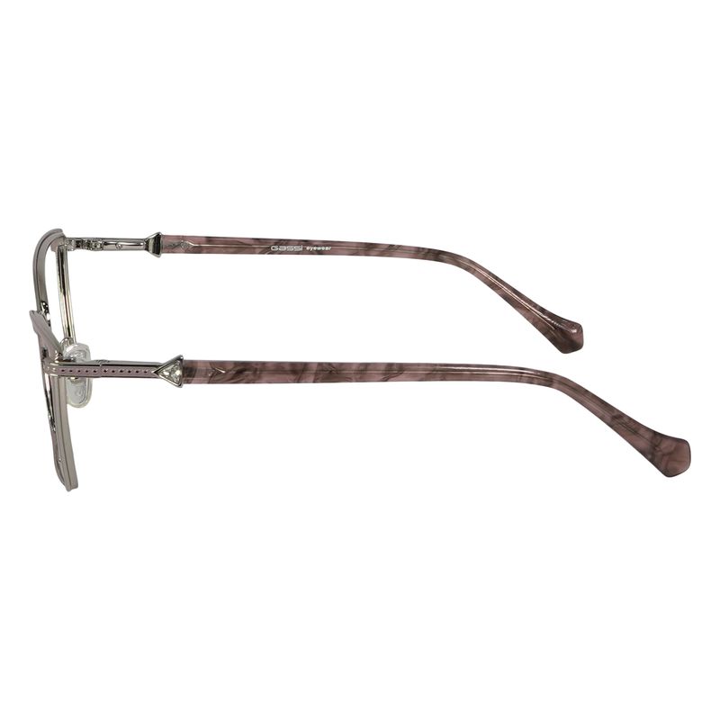 Óculos de Grau Gassi Miriã Nude com armação em metal nude, formato quadrado com leve gatinho e pedraria discreta nas hastes, para quem prefere modelos delicados.