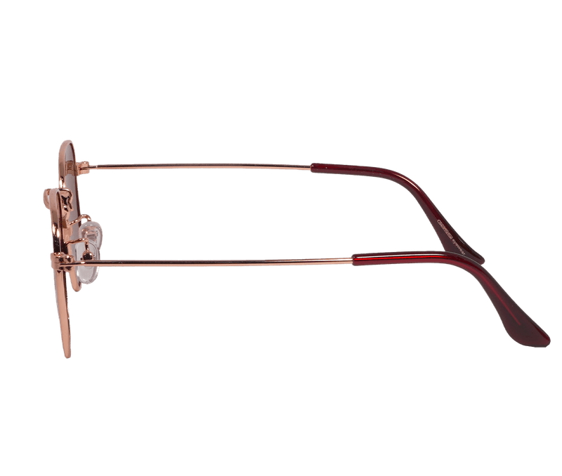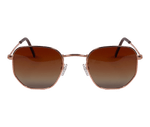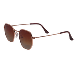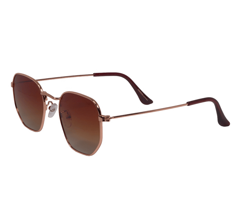 A combinação da armação fina em metal dourado com o design hexagonal cria um acessório sofisticado e chique. As lentes marrom degradê não apenas protegem, mas adicionam um ar de mistério e elegância a qualquer look, do passeio na praia ao evento urbano.